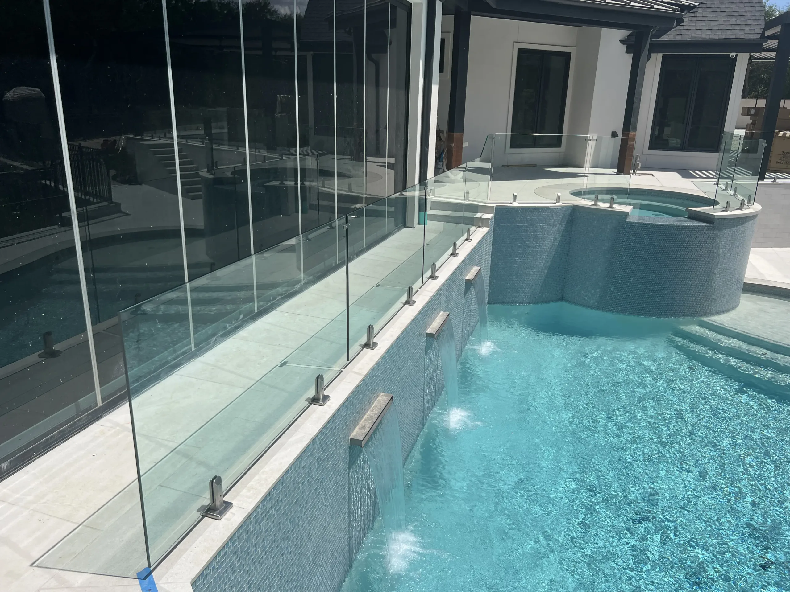 Tempered glass panels invite natural light while minimizing noise and wind, enhancing the overall poolside experience.